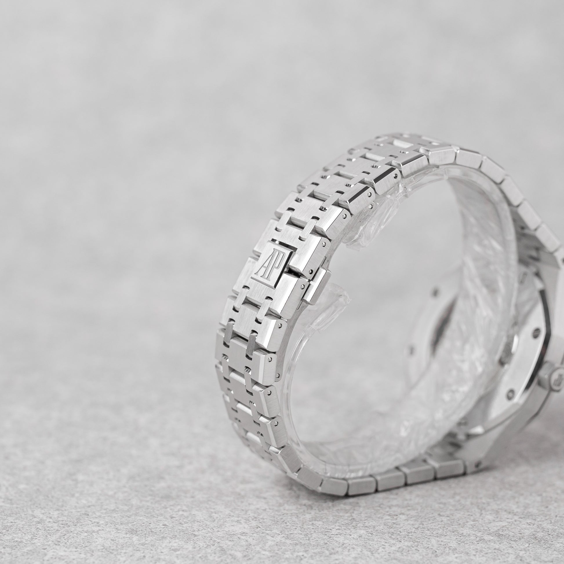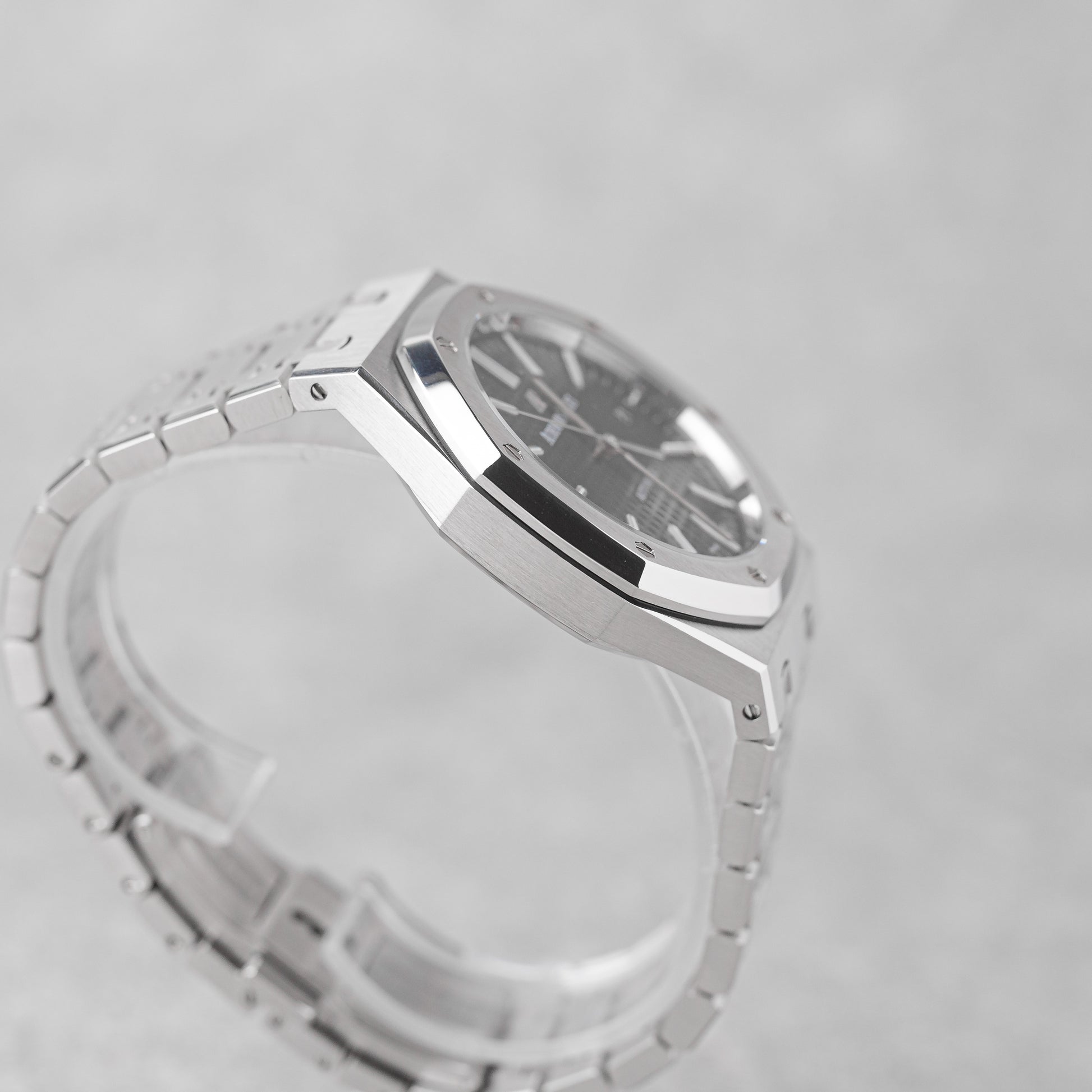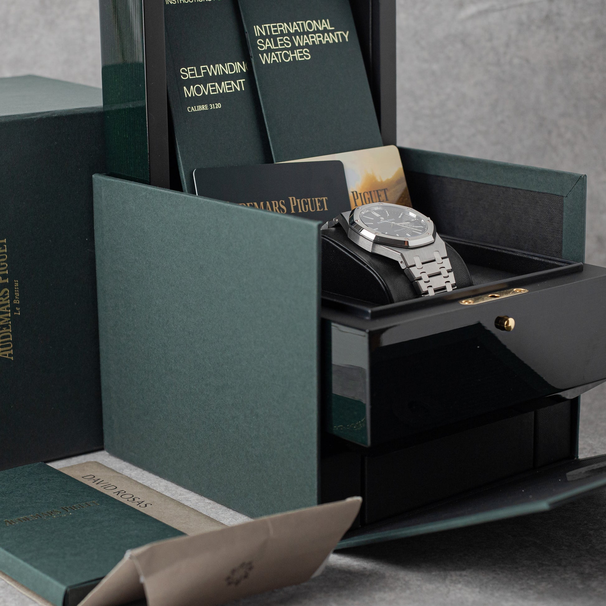 The Audemars Piguet Royal Oak 15400ST is a true icon, featuring the unmistakable Grande Tapisserie black dial and a 41mm stainless steel case. This example comes as a Full Set with full links and the original Portuguese invoice, reflecting its excellent provenance.