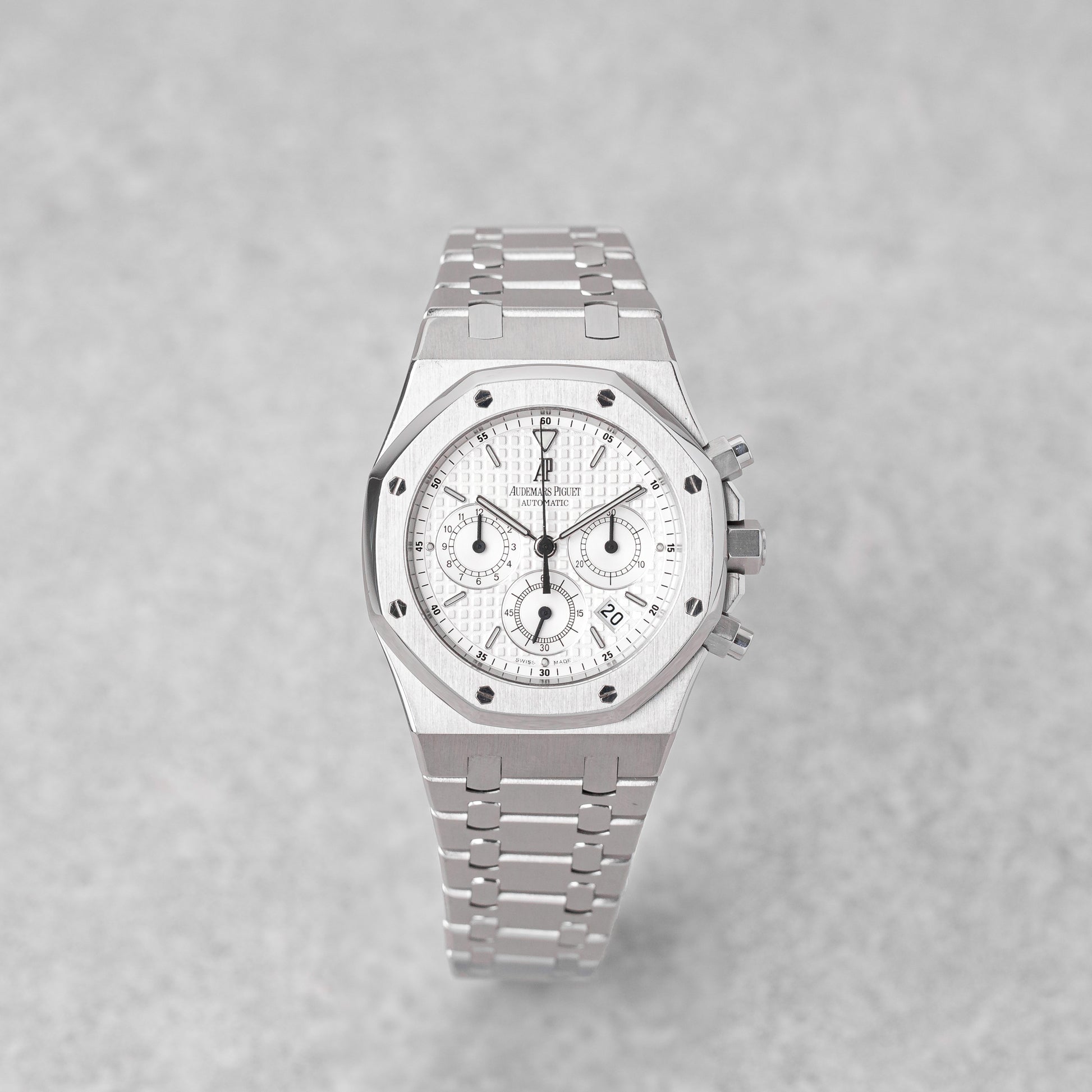 An iconic and collectible Royal Oak, this “Kasparov” Chronograph features the classic 39mm case with a refined white “Grande Tapisserie” dial, embodying the timeless design codes of Audemars Piguet.