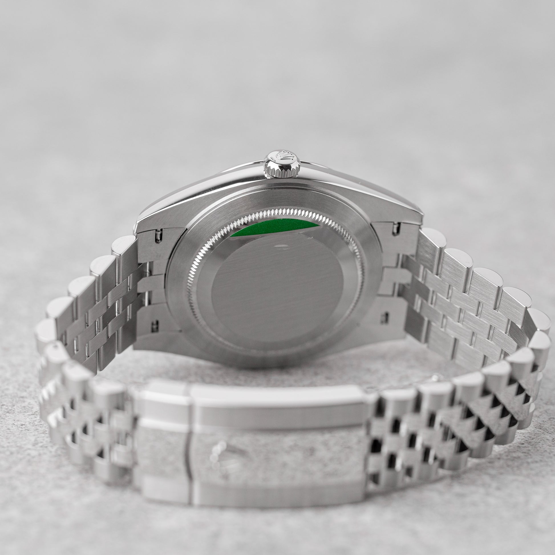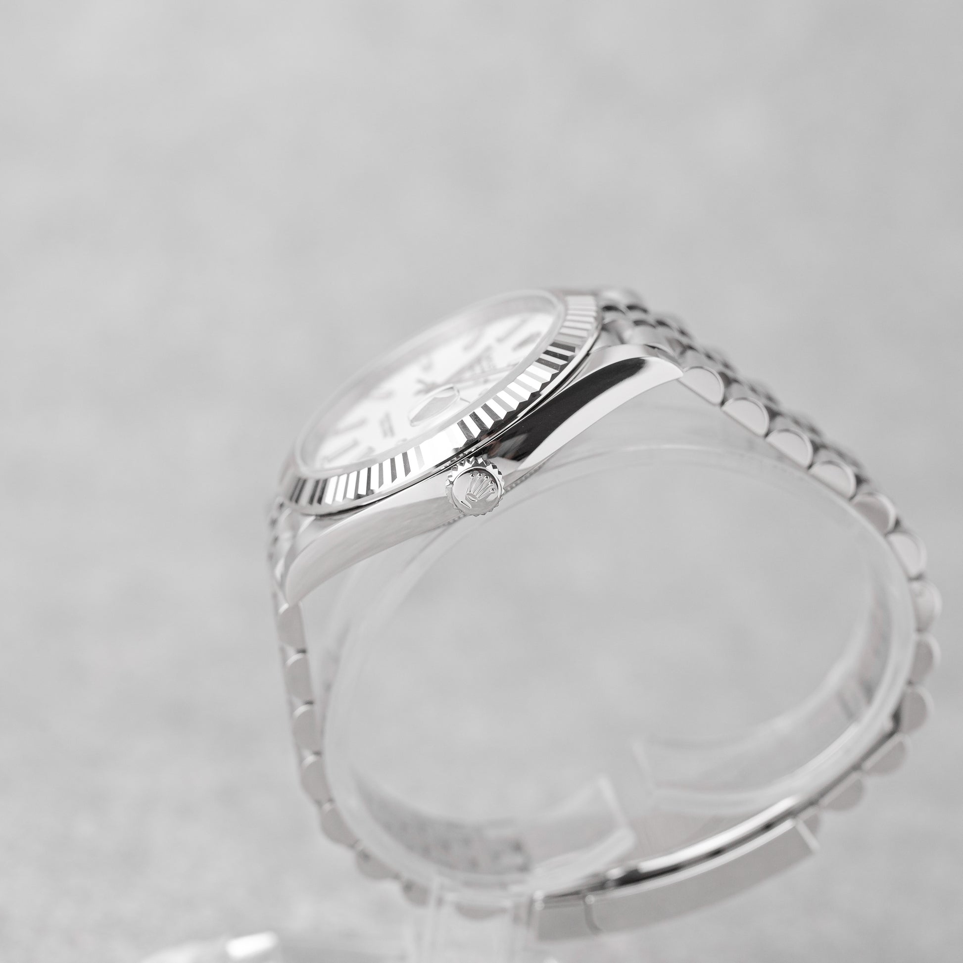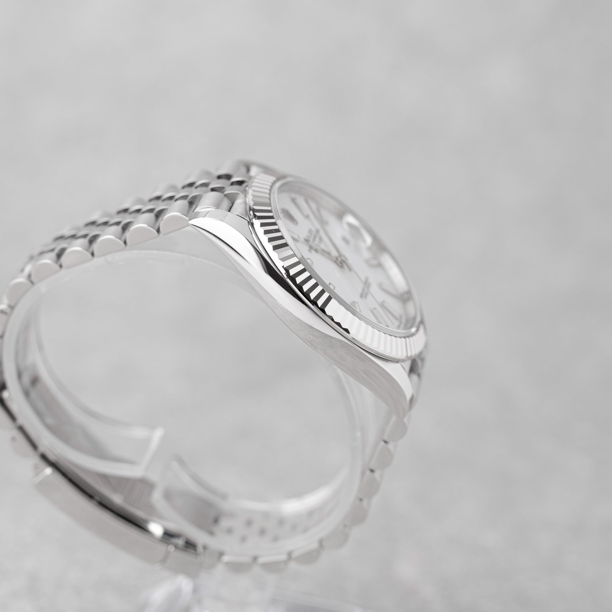 This elegant Rolex Datejust 41 features the white dial, a white gold fluted bezel, and the classic Jubilee bracelet. Delivered as a Full Set with original invoice from 10/2025, it is in new condition and covered by the 5-year Rolex international guarantee.