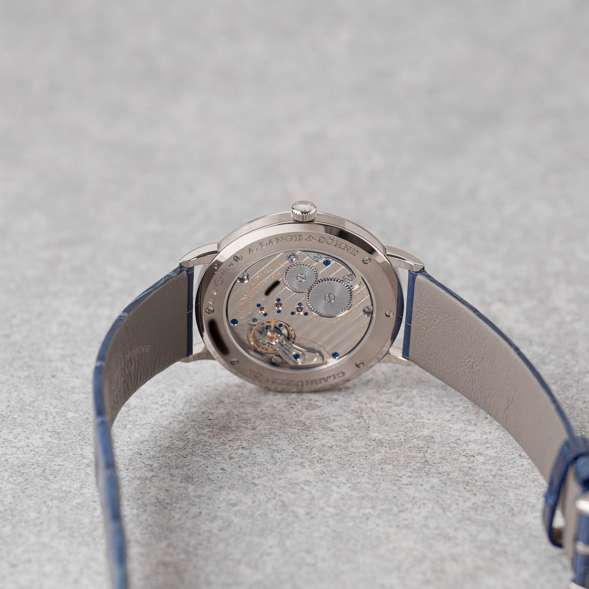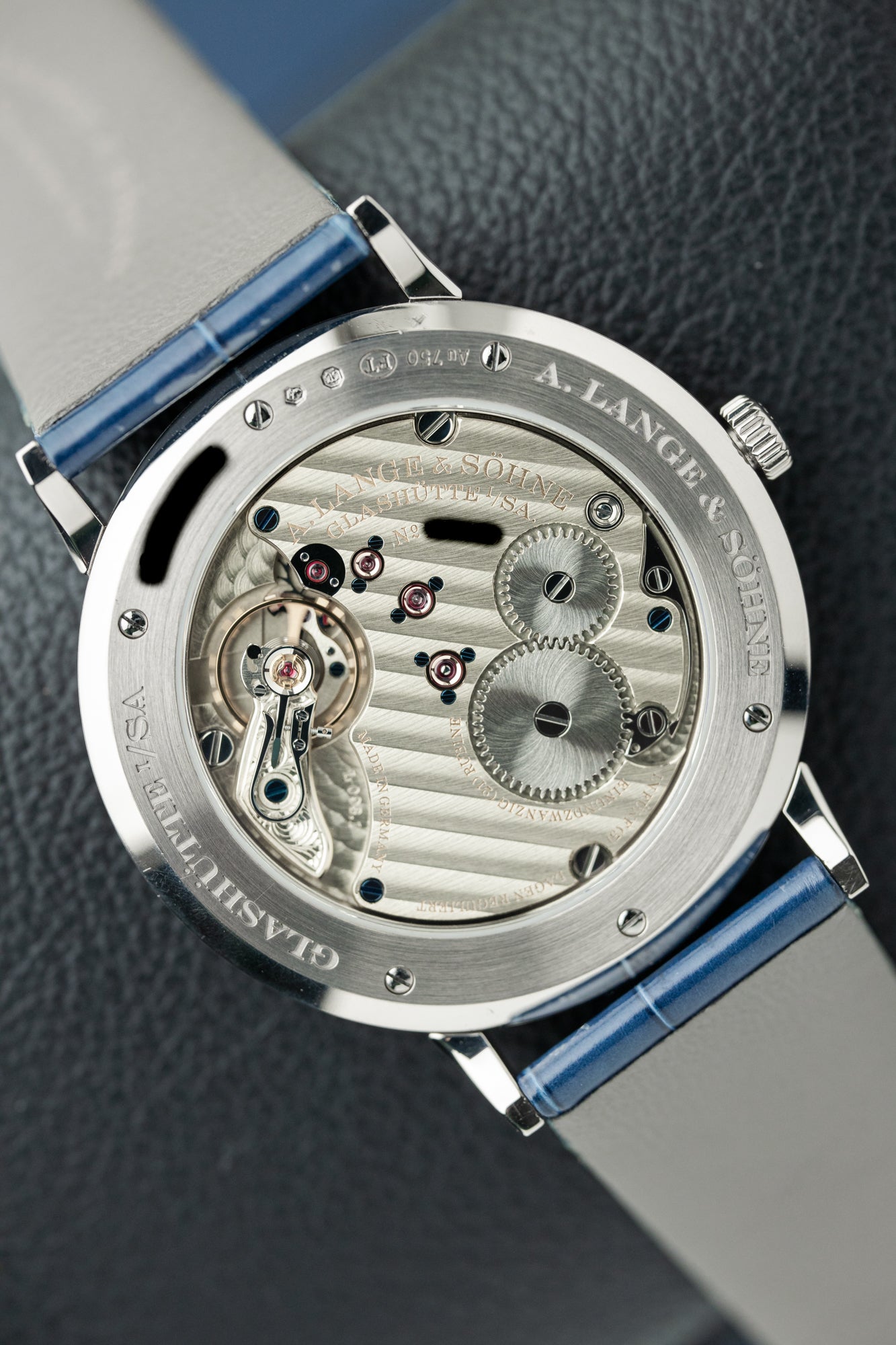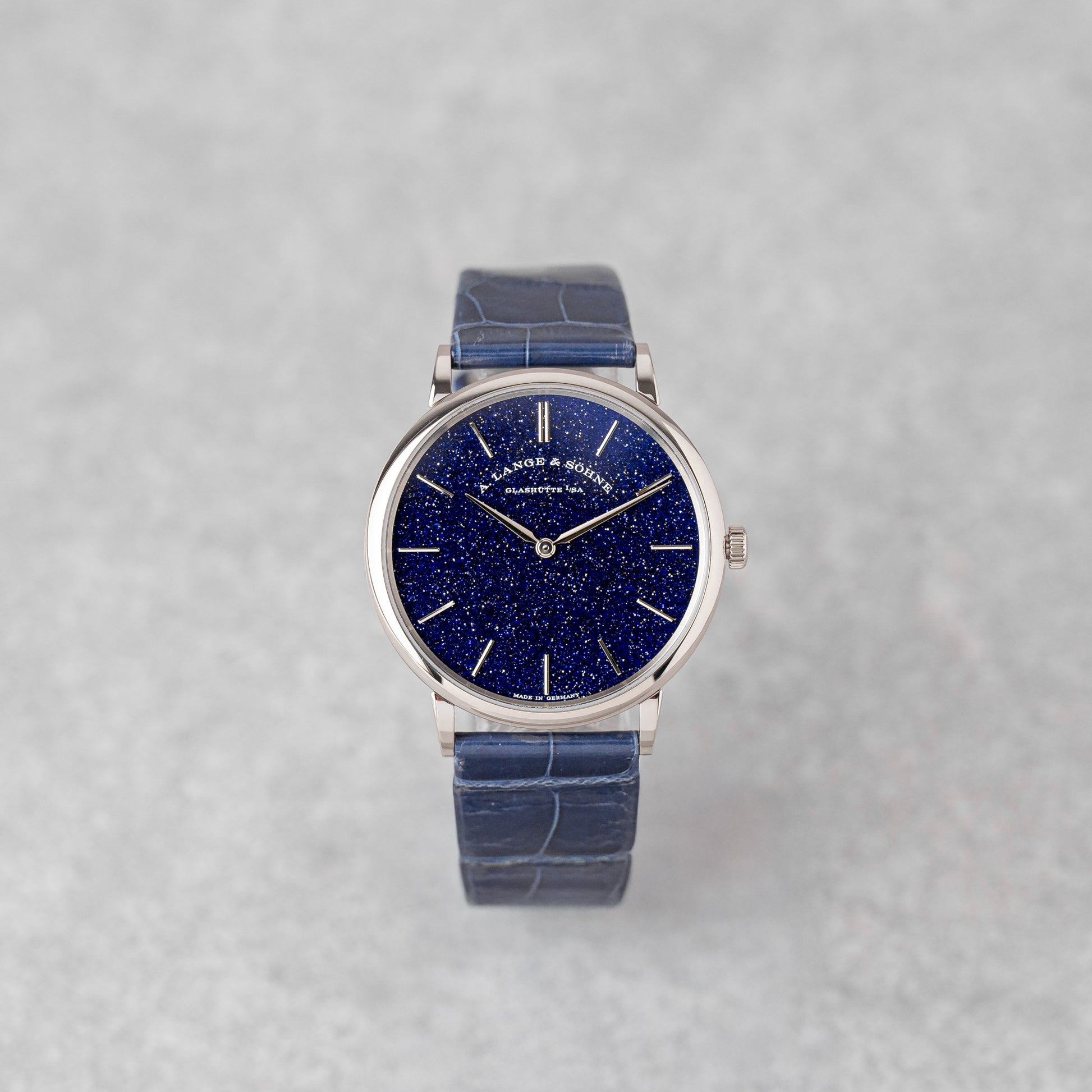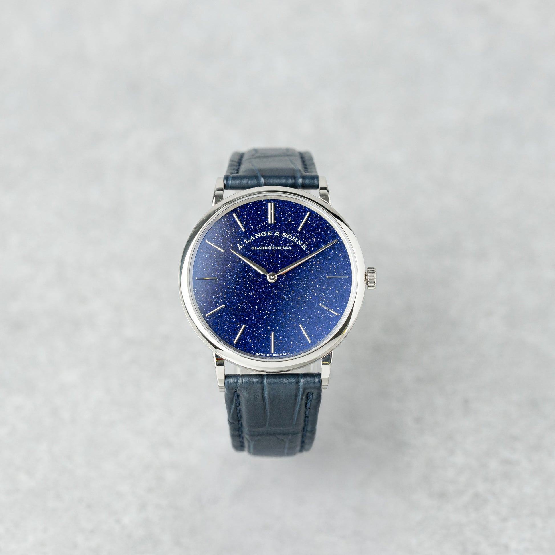 O Saxonia Thin é o relógio mais fino do fabricante, incorporando um puro minimalismo horológico com uma exibição elegante de horas e minutos apenas. Fabricado em ouro branco, apresenta um refinado mostrador de prata 925 acabado com fluxo de ouro azul-escuro, oferecendo uma profundidade e sofisticação subtis.