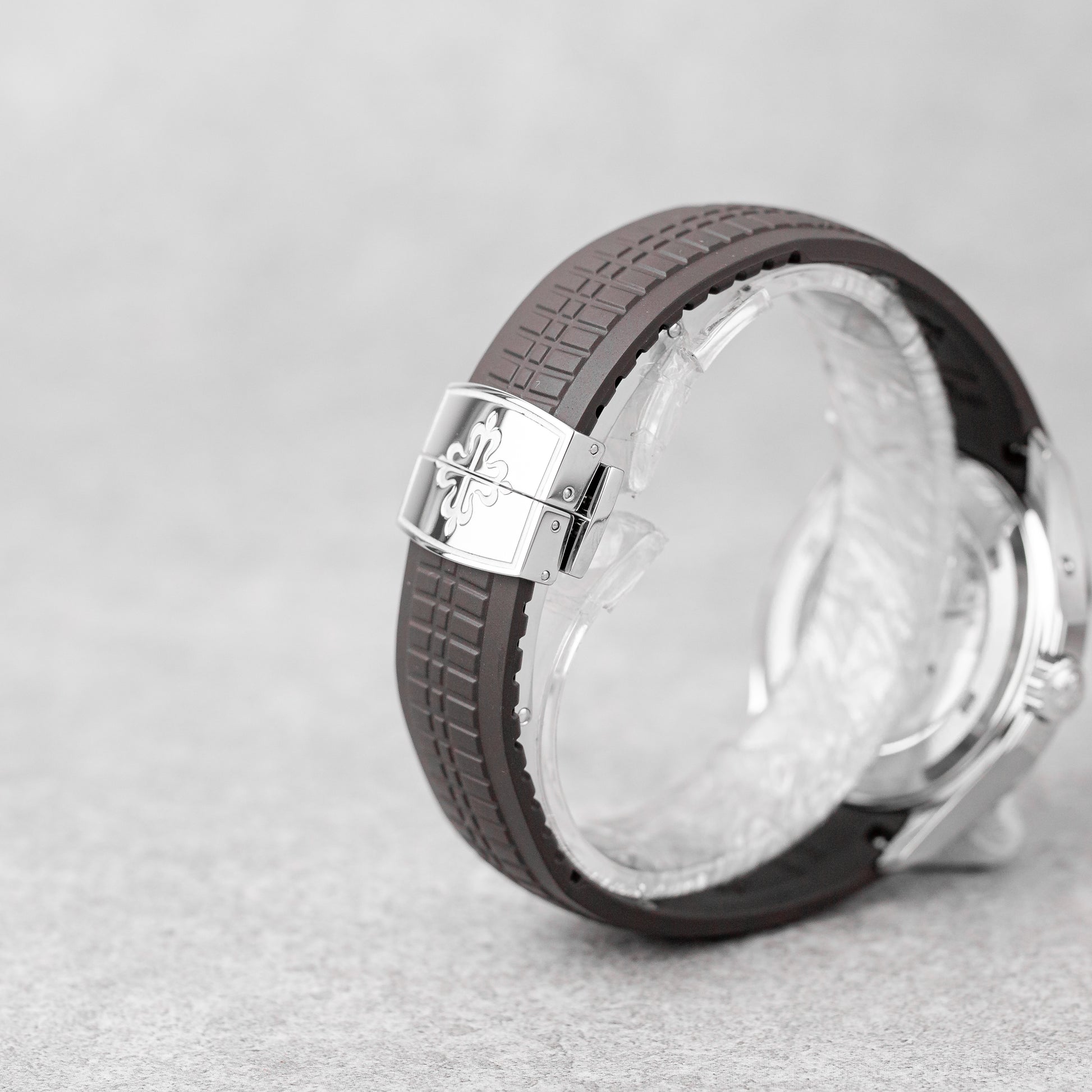 O relógio inclui duas correias de borracha originais Patek Philippe: uma correia castanha que foi cortada e usada, e uma correia preta nova em folha.