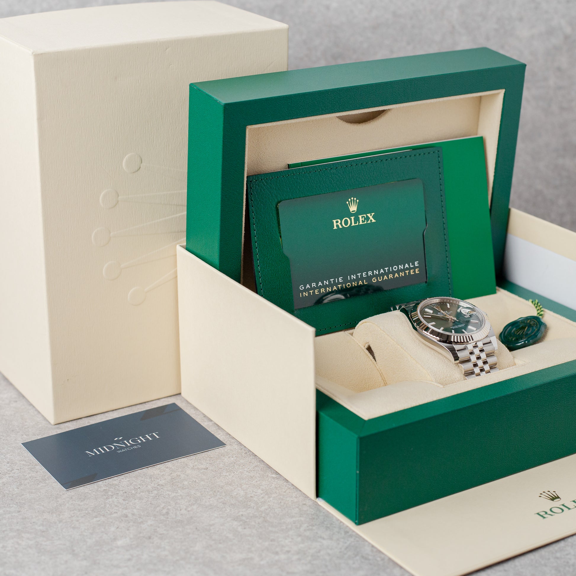 O Rolex Datejust 41 Green Dial Ref: 126334 é um exemplo deslumbrante de sofisticação e estilo. Apresentando um mostrador verde vibrante, bezel estriado e uma clássica bracelete Jubilee, este relógio está em new condition. Este conjunto completo, de 11/2025, vem com 5 years of international Rolex guarantee, tornando-o uma escolha fantástica para colecionadores e entusiastas.