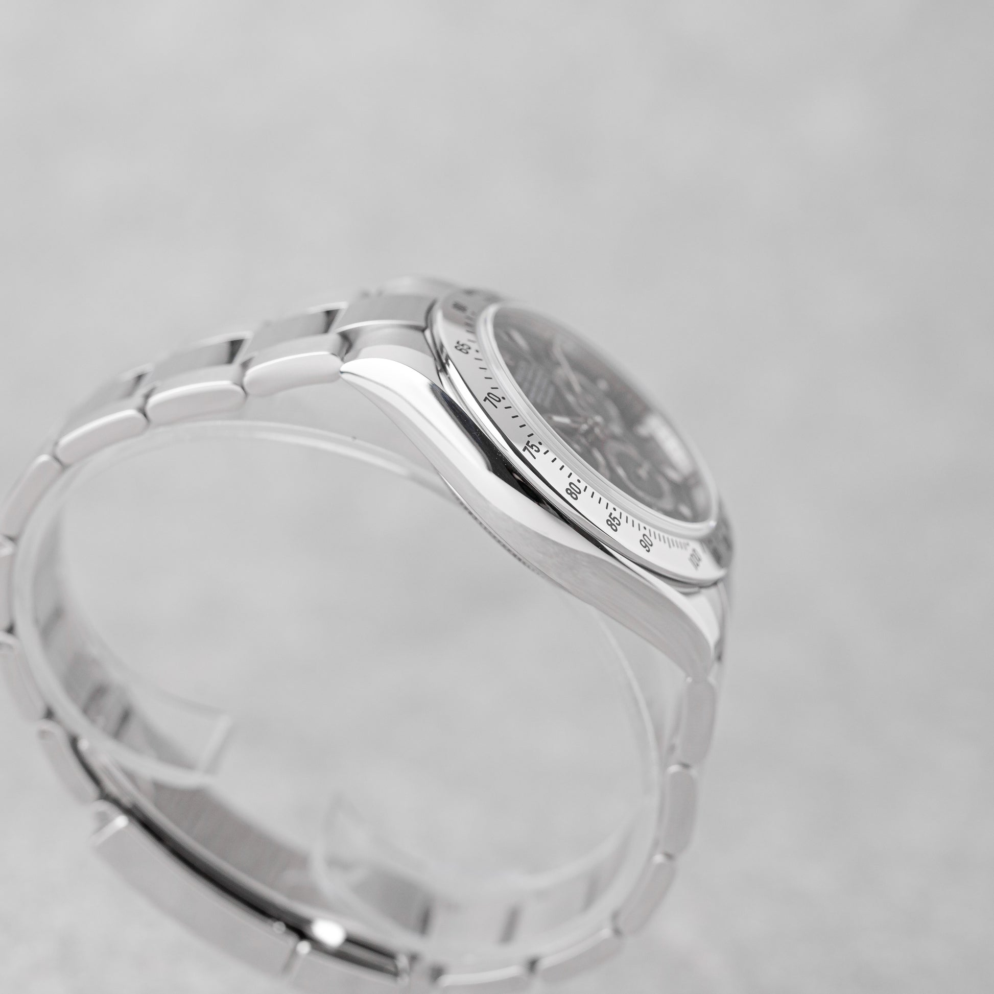 Uma verdadeira peça de colecionador, este Rolex Cosmograph Daytona Ref. 116520 apresenta um elegante mostrador preto alojado em uma caixa e bezel de aço inoxidável não polido, preservando suas linhas originais de fábrica.