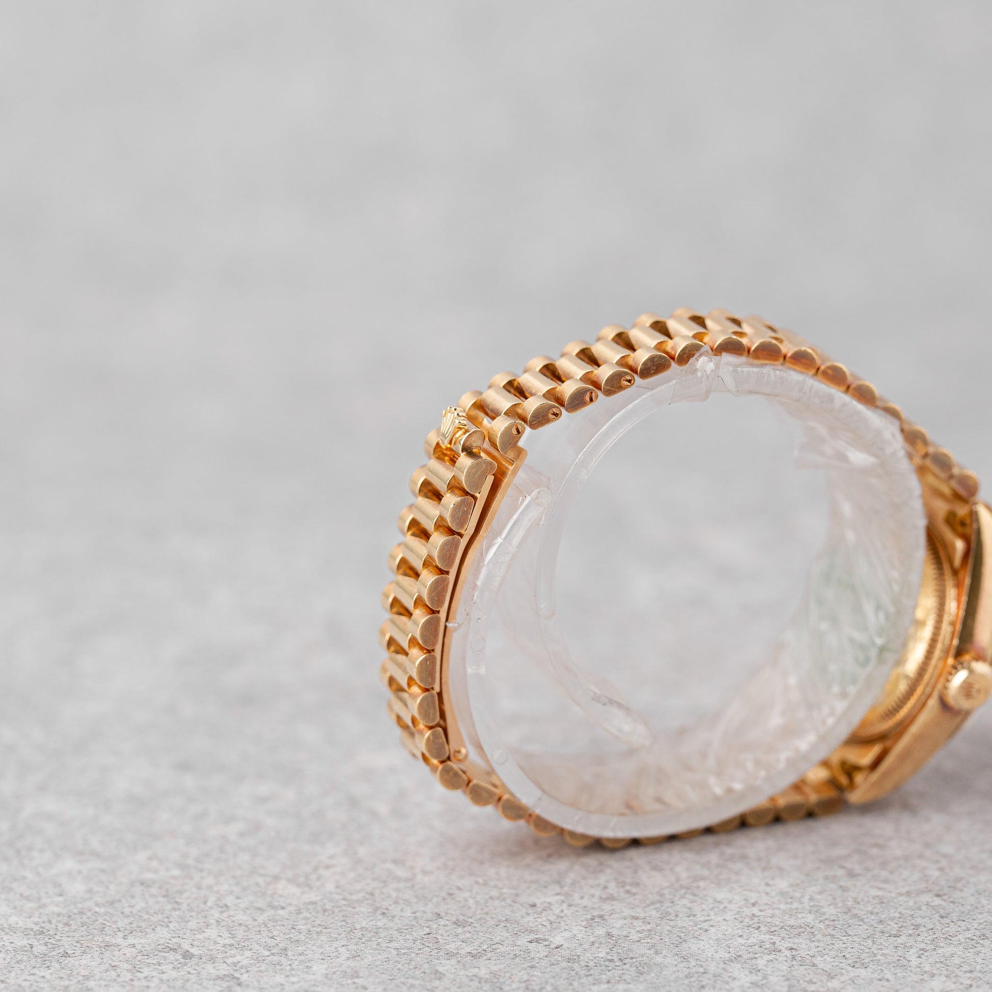 Um símbolo intemporal de elegância, este Rolex Lady-Datejust 26 em ouro amarelo 18k apresenta um mostrador champanhe clássico, exalando calor e sofisticação. Entregue como um Conjunto Completo , o relógio permanece não polido , preservando a sua forma original, com uma pulseira President justa que não mostra alongamento e em excelente estado geral .